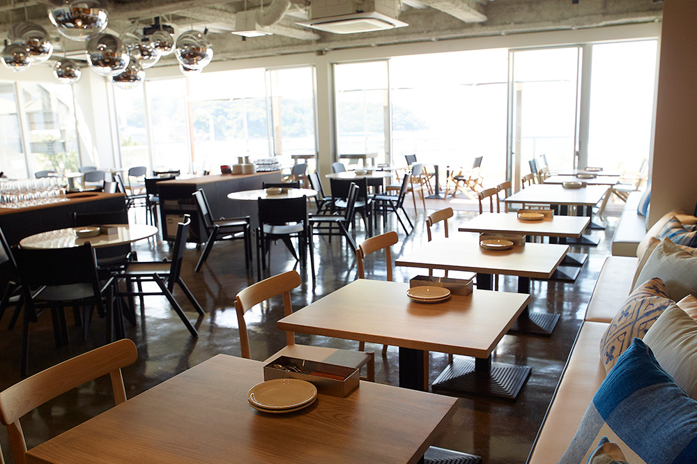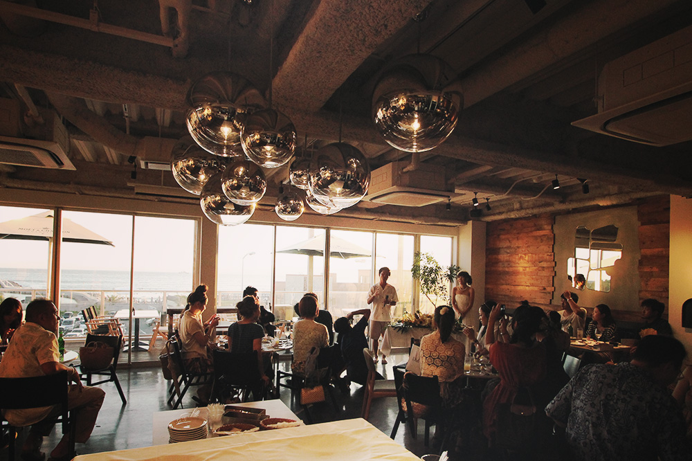 壁面いっぱいのベンチシートは無造作にころがしたクッションでセカンドハウスの リビング感を。テラスは、江ノ島を間近に見据えた景色と開放感を同時に味わうスペシャルシート。 光の球を思わす照明が波のようにキラキラ輝く上質な大人のカジュアルダイニング。全78席。